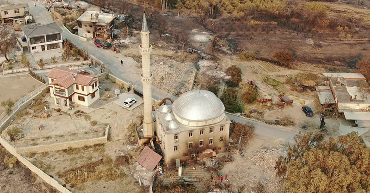 Antalya'nın Manavgat ilçesinde meydana gelen orman yangınında yaklaşık 65 evin yanarak küle döndüğü Kalemler Mahallesi'nde yanan evlerin ortasında bulunan caminin sadece dış duvarları zarar gördü.