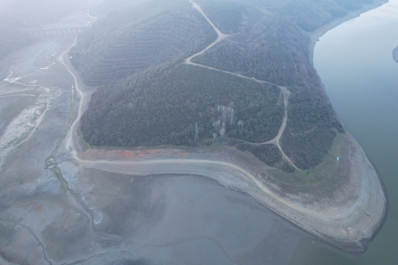 Alibeyköy Barajı'nda su seviyesi azalınca batık halde olan otomobil ortaya çıktı. Baraj havadan görüntülendi.