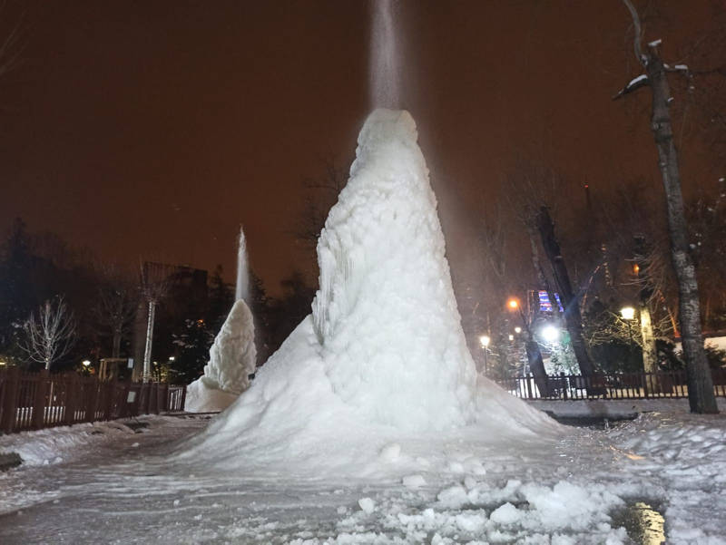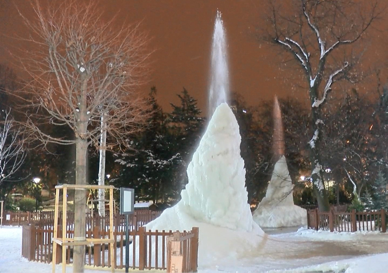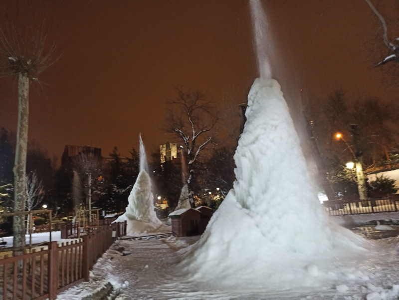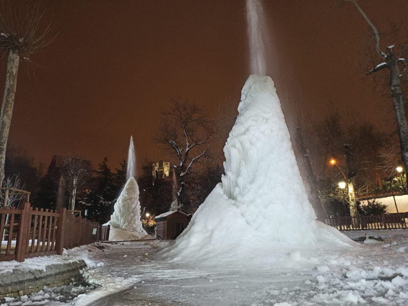 Gölde bulunan fıskiyelerden çıkan suların donmasıyla, boyları 3-4 metreyi bulan ve peri bacalarını andıran buz kütleleri oluştu.