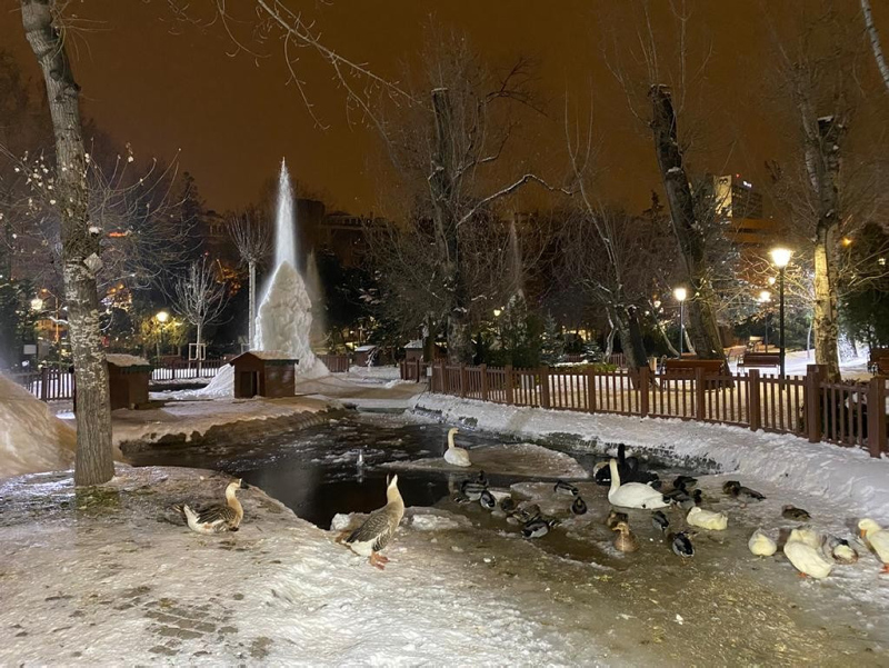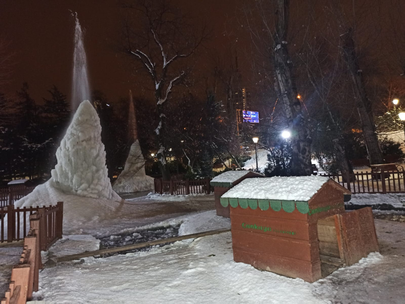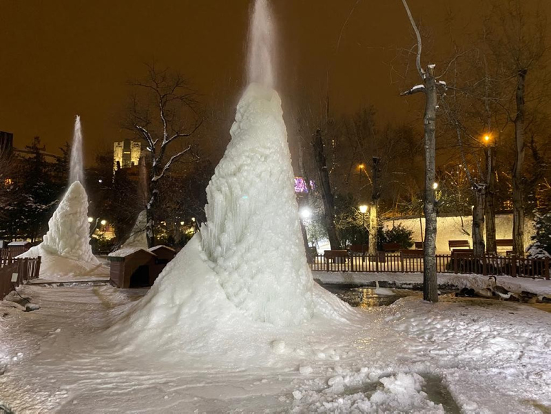 Ankara'da hava sıcaklıklarının sıfırın altıda 8 dereceye kadar düşmesiyle, kentin simgelerinden olan Mogan Gölü buz tuttu. Kuğulu Park'taki fıskiyelerden çıkan sular ise donarak peri bacalarını andıran görüntüleri andırdı
