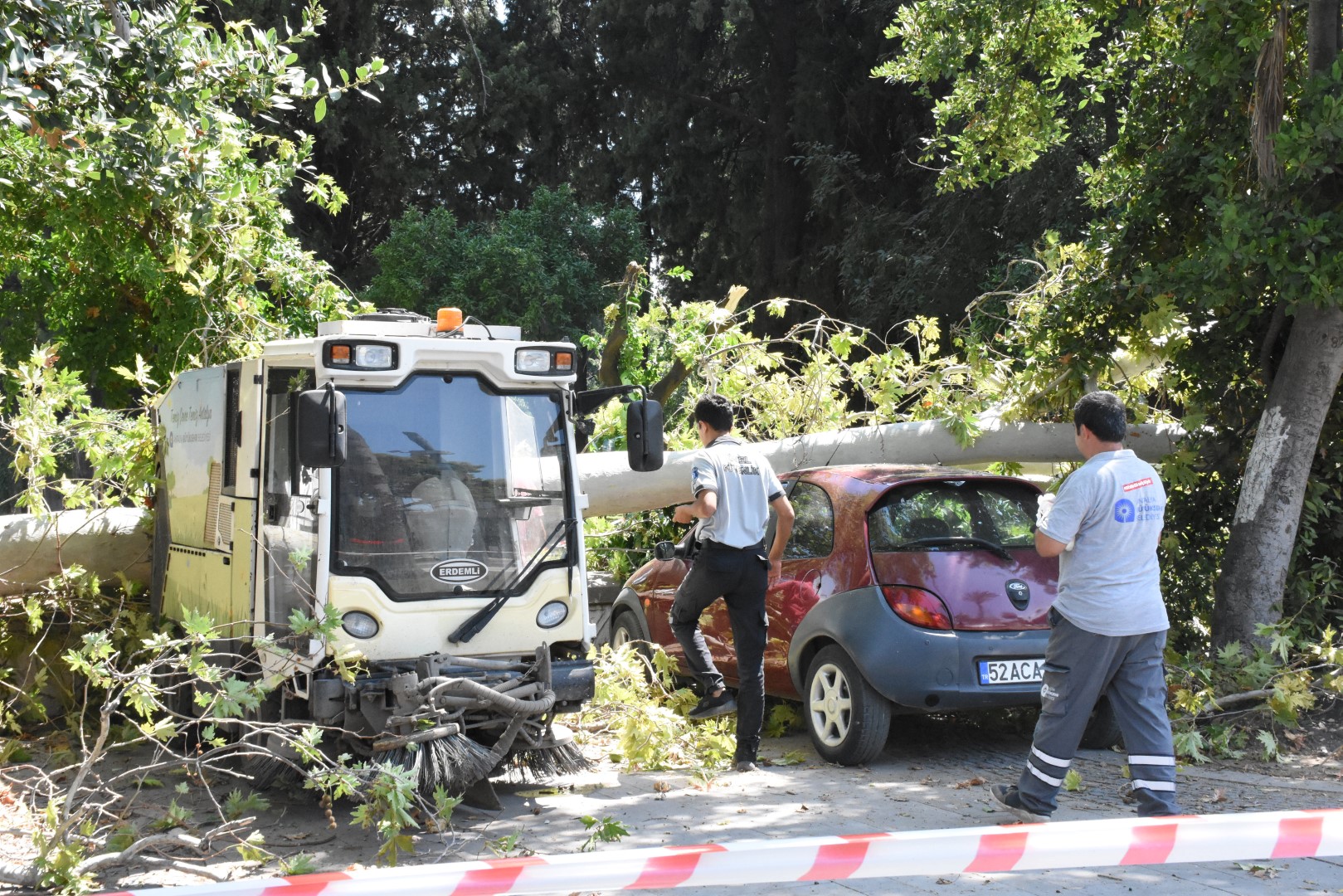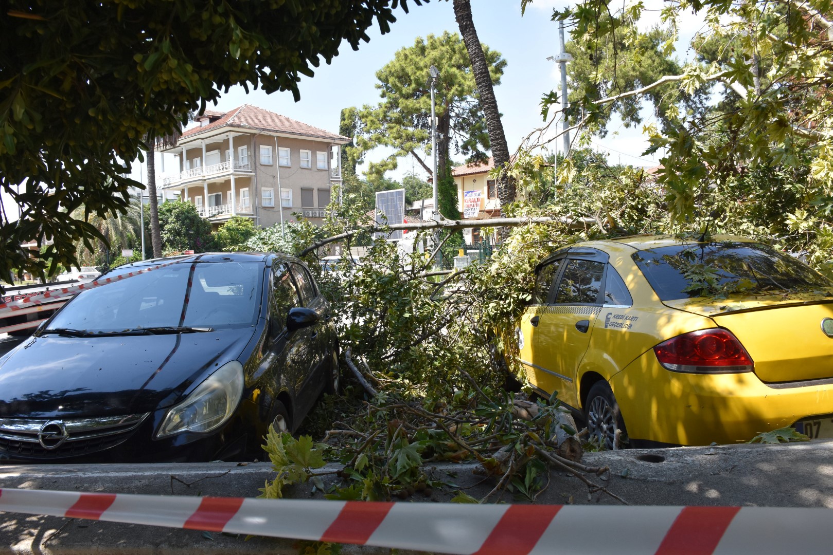 Toz bulutunun kapladığı alanı kontrol eden belediye ekipleri, ağaç dallarının araçların üzerine devrildiğini ve biri belediyenin temizlik aracı olmak üzere park halindeki 5 aracın zarar gördüğünü tespit etti.