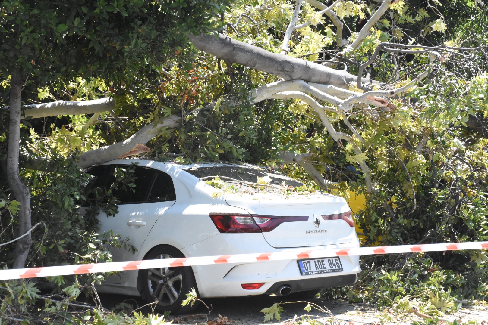 Antalya'nın Muratpaşa ilçesinde, çürüyen büyük çınar ağacının dallarının kırılarak devrilmesi sonucu park halindeki 5 araçta hasar oluştu. İşte olay yerinden fotoğraflar...