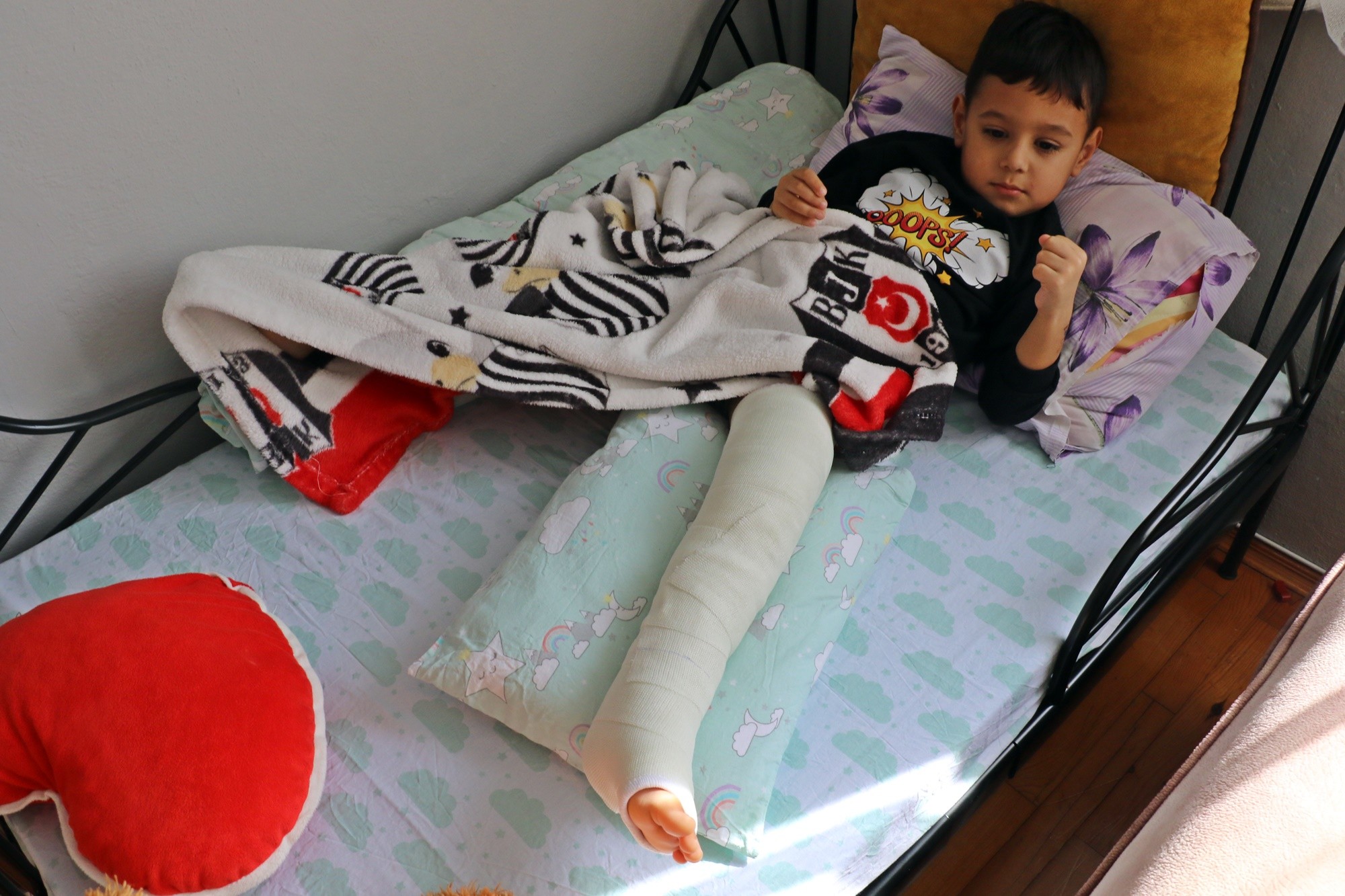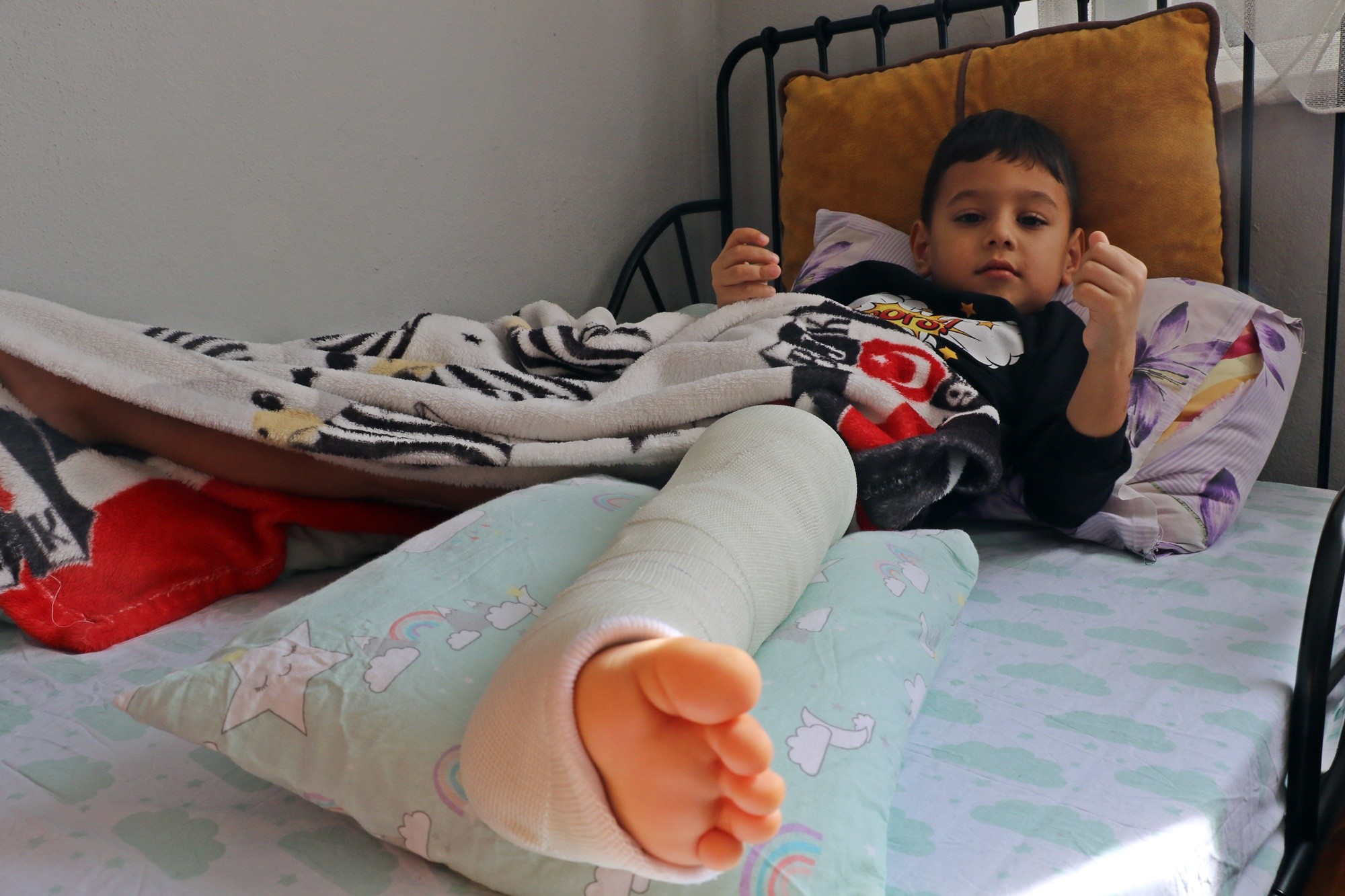 Bacağında kaval ve fibula kemiği kırılan minik Umut, tedavisinin ardından taburcu oldu.