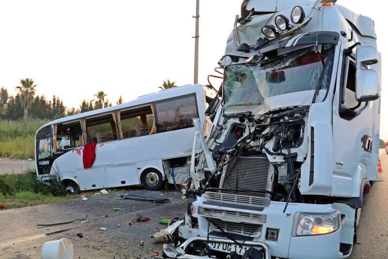 Antalya'da tatilin ardından havalimanına giden Rus turistleri taşıyan midibüse sabah erken saatlerde mola vereceği sırada TIR çarptı. Çarpmanın etkisiyle savrulan midibüs başka bir araca daha çarparak su kanalına düştü. Feci kazada 13 kişi yaralandı...