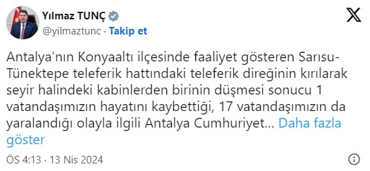 Antalya'da dün (12 Nisan), Büyükşehir Belediyesi'ne ait teleferiğin direklerinden birinin yerinden koparak kabine çarpması sonucu büyük bir kaza yaşandı. Kabinin tabanının kopmasıyla içerisinde bulunan 8 kişi metrelerce yükseklikten yere düştü. Kazada, kabinde bulunan 1 kişi hayatını kaybederken, 10 kişi de yaralandı. Ölen ve yaralanan kişilerin kimlikleri belirlendi.