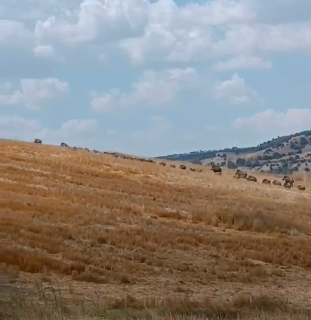 Çorum'un Sungurlu ilçesinde yaşayan bir vatandaş karşılaştığı domuz sürüsü ile şaşkına döndü. Görüntülerde 60'a yakın yaban domuzunun arazide ilerlediği görüldü.