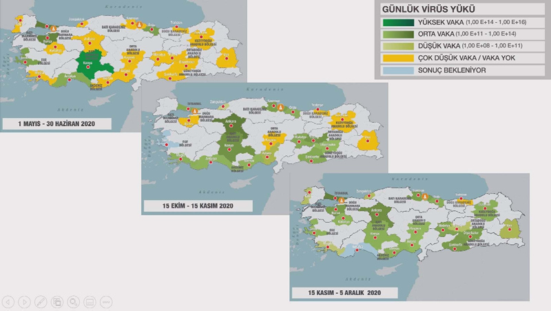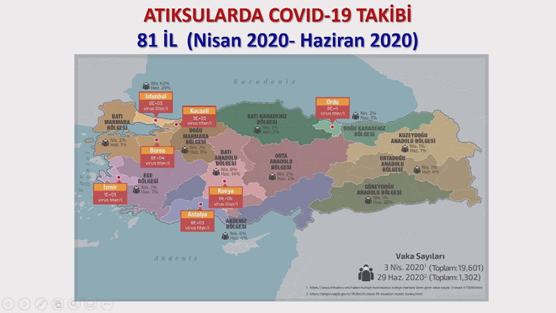 Türkiye'de koronavirüsün atık sulardaki varlığının araştırılması için devam eden çalışmalar sonucunda, virüsün yayılımı haritalar üzerinde gösterildi. Sonuçlara göre şu anda vaka sayılarının en yüksek olduğu iller İstanbul, Bursa ve Ankara. Mayıs ayında atık sulardaki virüsü bir anda görememeye başlayan proje ekibi, bunun nedeninin ise virüsün uğradığı mutasyon olduğunu ifade ediyor.
