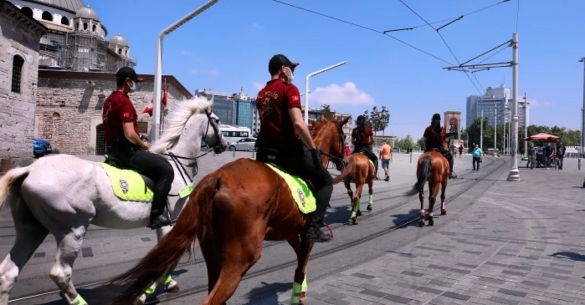 İstanbul Emniyet Müdürlüğü Çevik Kuvvet Şube Müdürlüğü'ne bağlı Atlı Polis Grup Amirliği ekipleri Taksim Meydanı ve İstiklal Caddesi çevresinde 4 atlı polisle denetim yaptı.