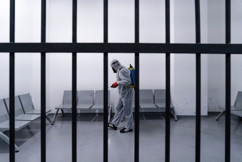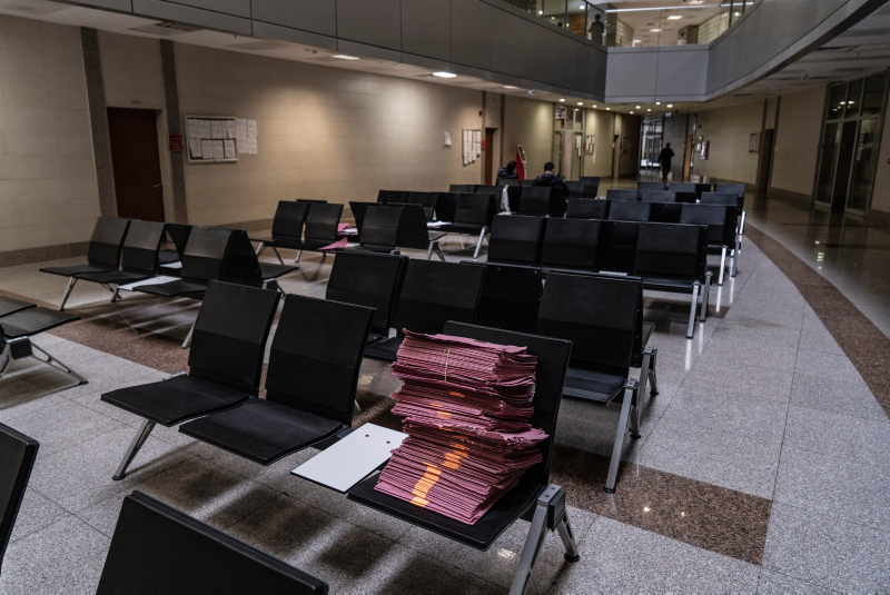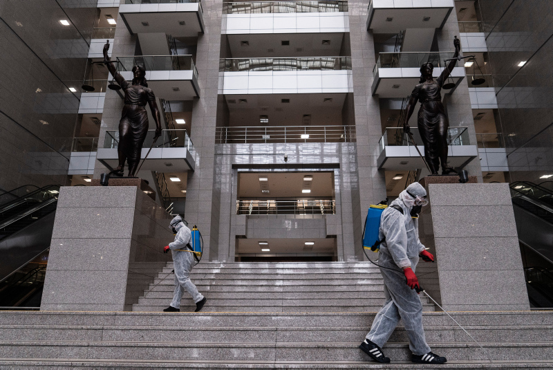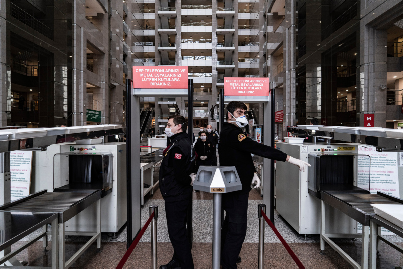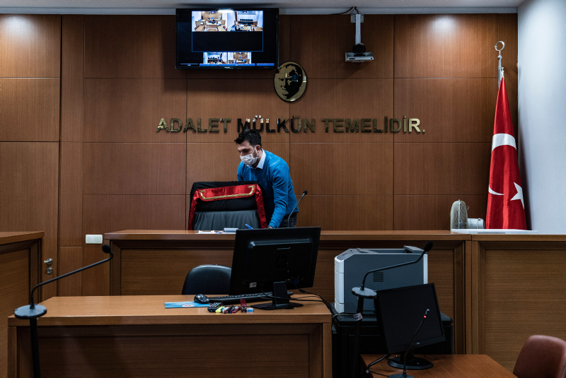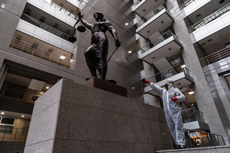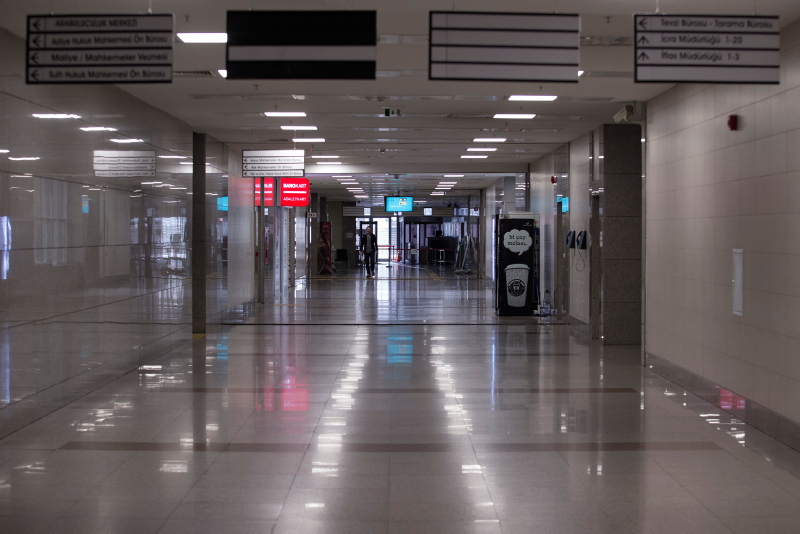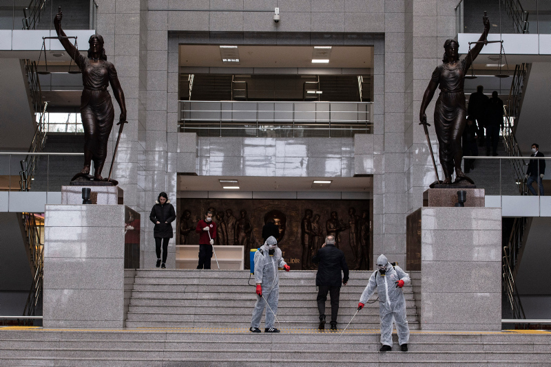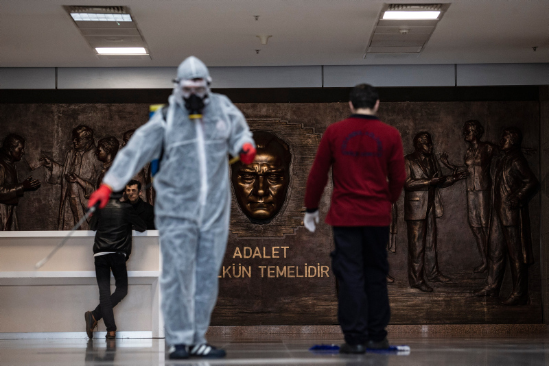 Avrupa'nın en büyük adliyesi olduğu belirtilen Çağlayan'daki İstanbul Adalet Sarayı'nda, koronavirüs salgını sonrası kapsamlı önlemler alındı. Özel izinle girilen adalet sarayında mahkeme salonlarından, nezarethanelere, infaz bürolarından yemekhanelere kadar her bölümde alınan tüm yoğun tedbirleri görüntüledi.
