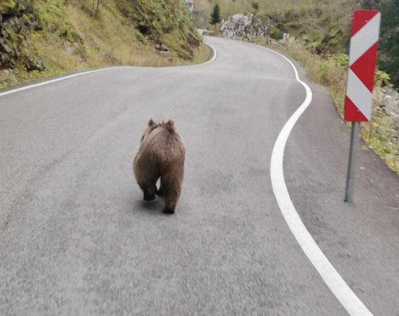 Sürücü araçların sıklıkla kullandığı yolda ilerleyen ayıya herhangi bir zarar gelmemesi için bir süre eşlik etti.