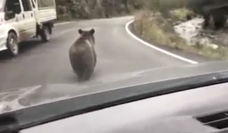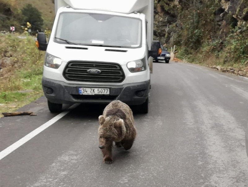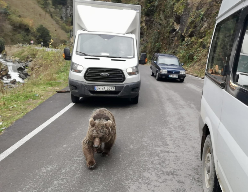 Ayının dikkatini çekmek isteyen sürücü hayvana seslendi bağırdı hatta araçla hafif bir şekilde dokundu ama ayının dikkatini yine çekemedi.