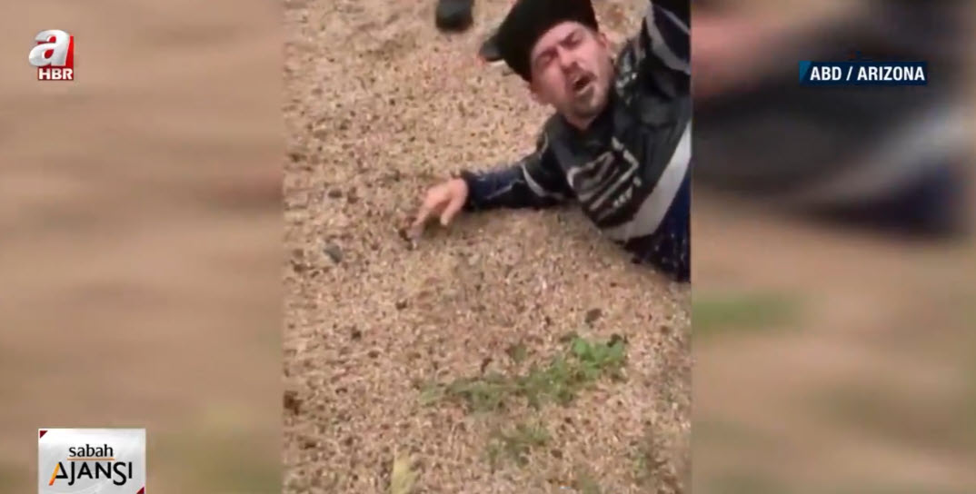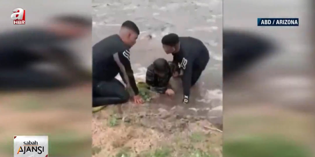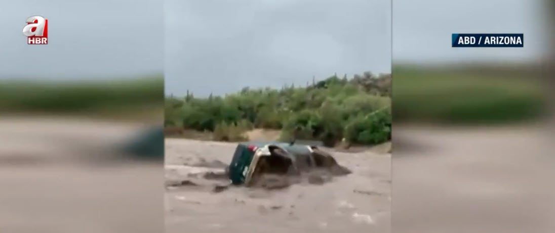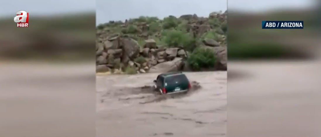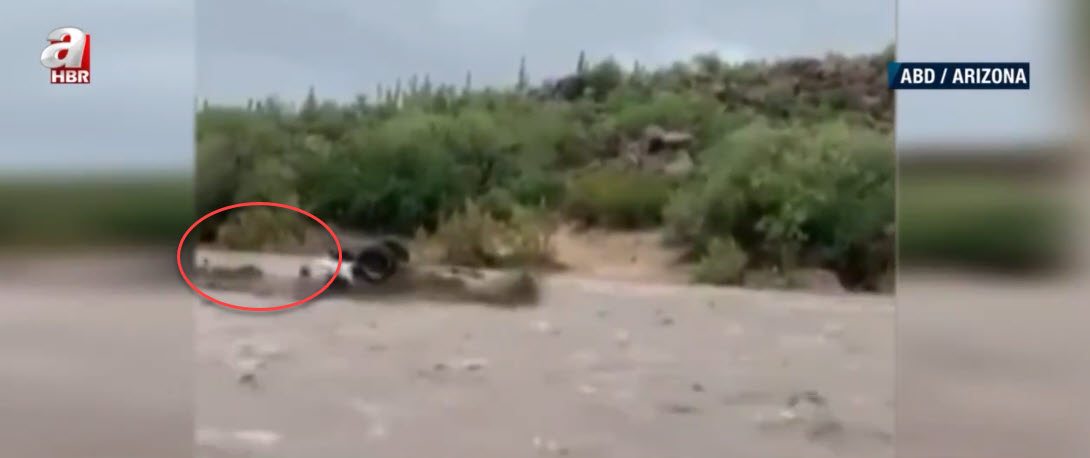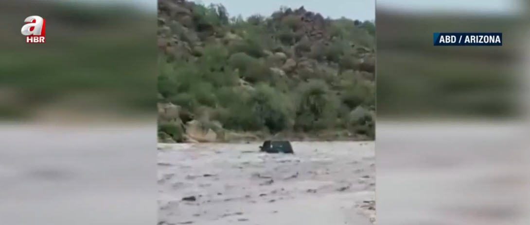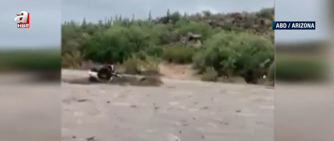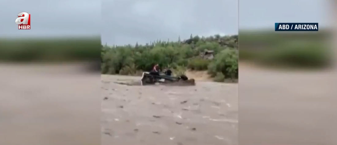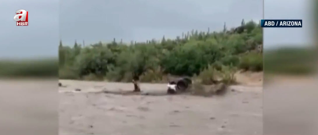 Görüntü günlerdir yağışların etkisi altında bulunan ABD'nin Arizona eyaletinden. Nehir yatağı yakınlarından geçen baba ve oğlu, aniden bastıran yağışın ardından gelen selle sürüklenmeye başladı.