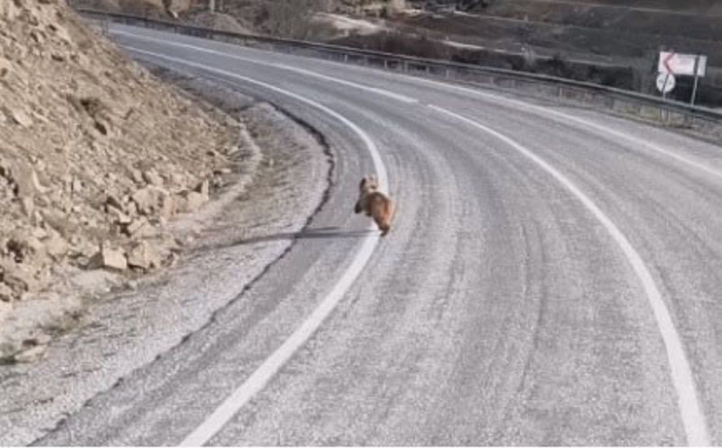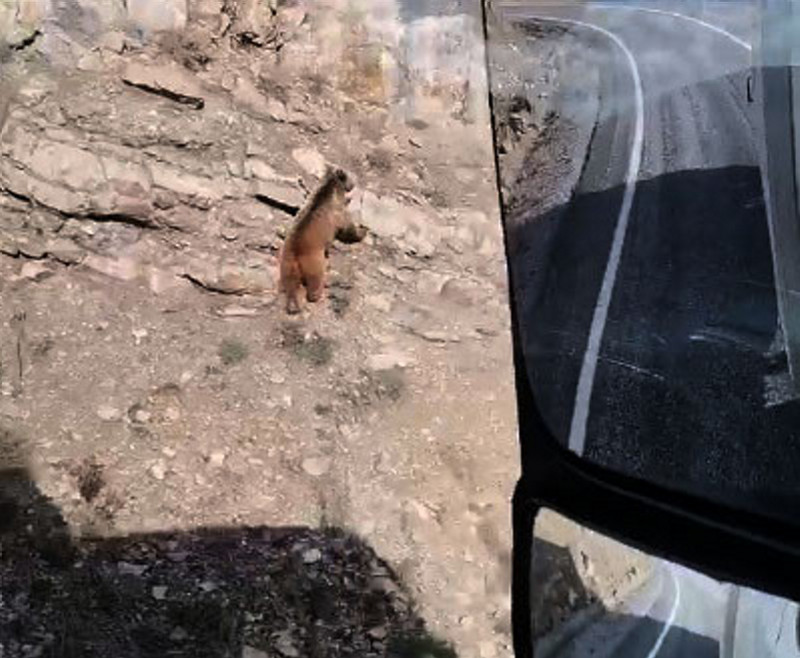 Pusat köyü yolunda kamyonet ile gezmeye çıkan Ahmet Şahin ve arkadaşı Erdi Özarslan'ın önüne aniden ayı yavrusu çıktı.