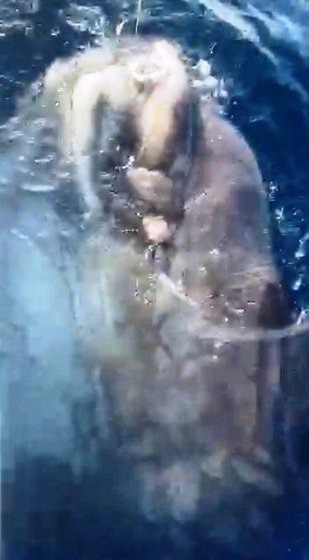 Tekneye doğru çekilen balığın Türkiye'de ender görülen ve nesli tükenmekte olan Ay Balığı olduğunu gören balıkçılar, dev balığı tekrar denize bıraktı.
