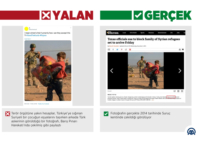 PKK yanlısı sosyal medya hesapları, Yunanistan'a sığınan Suriyeli bir anne ve bebeğinin fotoğrafını, "Barış Pınarı Harekatı'ndan kaçan siviller olarak yansıtmaya çalıştı. Fotoğraf 2016 yılında Yunanistan'da çekildi.