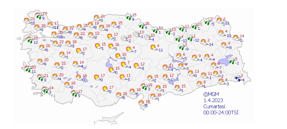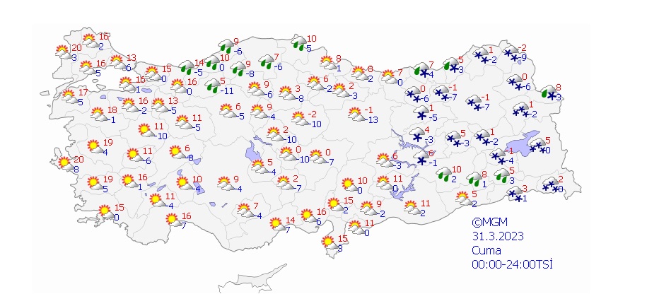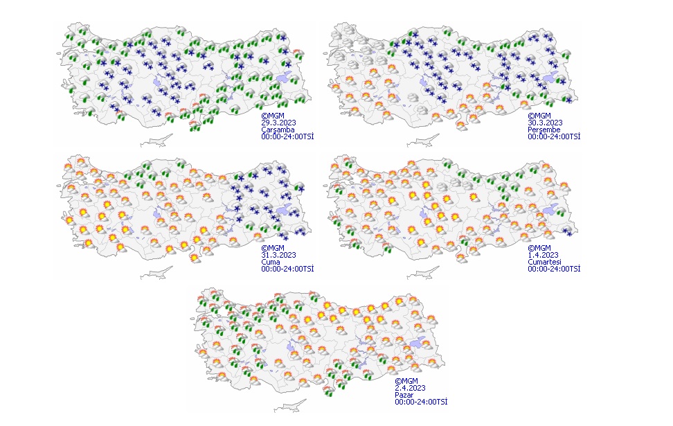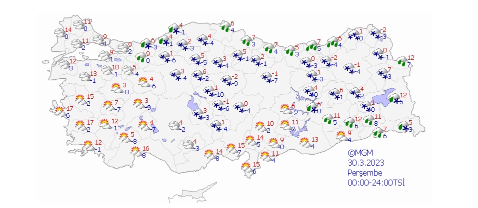 Yağışların Orta ve Doğu Akdeniz ile Orta ve Doğu Karadeniz kıyılarında yağmur ve sağanak diğer yerlerde karla karışık yağmur ve kar şeklinde olmak üzere; Doğu Akdeniz, İç Anadolu'nun doğusu, Karadeniz, Doğu Anadolu'nun kuzey ve batısı ile Bursa, Bilecik, Sakarya, Bitlis, Şırnak, Hakkari, Gaziantep, Kilis ve Adıyaman çevrelerinde yer yer kuvvetli olması bekleniyor.
