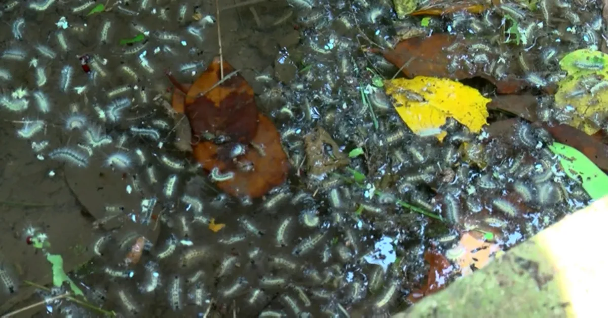 Tırtılların yapraklarını yediği ağaçların kuruduğu da görülüyor. Bir örümcek ağı gibi ağaçları saran tırtılların kozaları ise ilginç bir görüntü oluşturuyor.