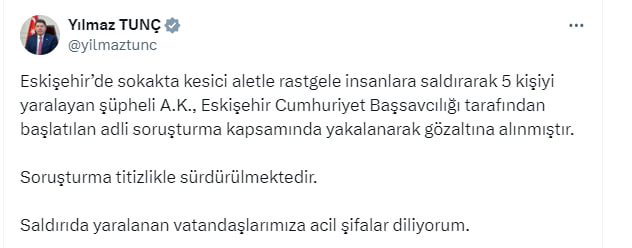 İçişleri Bakanı Ali Yerlikaya da sosyal medya üzerinden, "Eskişehir'de Tepebaşı Rauf Orbay Caddesi, Şehit Rüstem Demirbaş Parkı çay bahçesinde kesici aletle N.Ö., T.A., C.Ö., C.A. ve M.K. isimli 5 kişiye rastgele saldırarak yaralayan A.K. isimli şüpheli şahıs yakalanarak gözaltına alınmıştır. Saldırıda yaralanan vatandaşlarımıza acil şifalar diliyorum" şeklinde bilgi verdi.