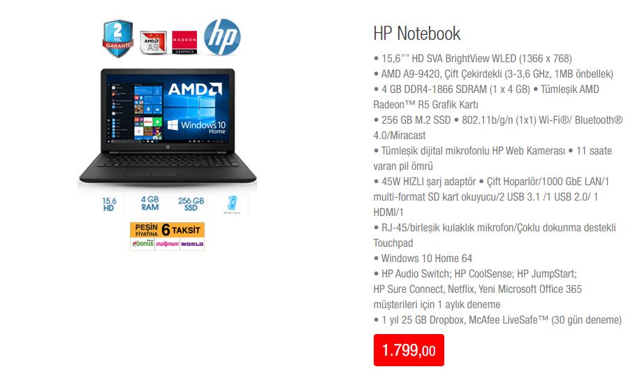 • AMD A9-9420, Çift Çekirdekli (3-3,6 GHz, 1MB önbellek)