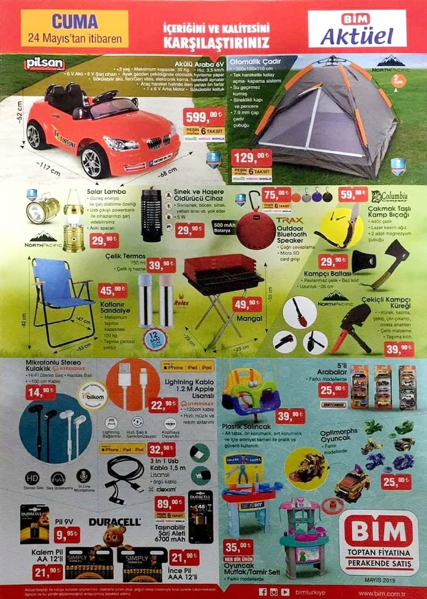BİM aktüel ürünler kataloğu 24 Mayıs yayına verildi. BİM kataloğu 24 Mayıs BMW akülü arabayı yıldız olarak tanıtırken, kamp ve piknik malzemelerine geniş yer ayırdı. BİM aktüel ürünler kataloğu 24 Mayıs henüz resmi siteden yayınlanmazken sizler için listeye ve görsellere ulaştık. BİM kataloğu 24 Mayıs ile Arnica Elektrikli Süpürge de çok cazip bir fiyata raflarda olacak. Ayrıca BİM indirimli ürünler kataloğu 21 Mayıs da yayınlandı. Peki, BİM 21 Mayıs indirimli ürünler neler? İşte BİM aktüel ürünler kataloğu 24 Mayıs ve BİM 21 Mayıs indirimli ürünler kataloğu fırsatları...
