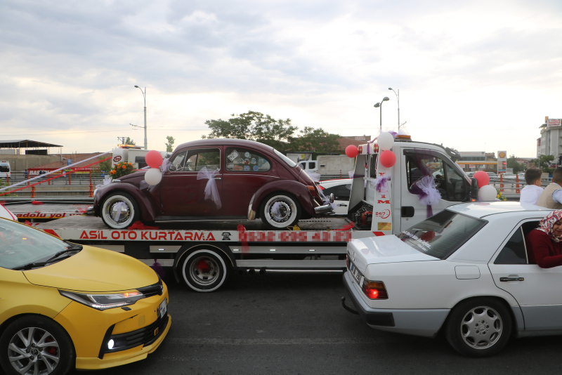 Malatya'da nişanlısının 'gelin arabası vosvos olsun' isteğini kırmak istemeyen oto kurtarma işi yapan damat Furkan Karakaplan, aracının üzerine yüklediği vosvosu ve çekiciyi gelin arabası yaptı.