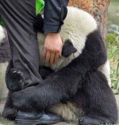 2006'da Çin'de çekilen bu fotoğrafta bir panda bir adamın bacağına sarılıyor. Çin Panda Koruma Merkezi'nde çekilen bu fotoğrafta dev panda kendisini besleyen adama minnetini böyle gösteriyor.