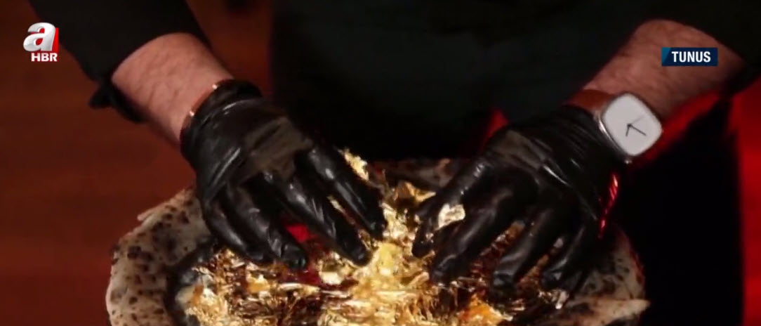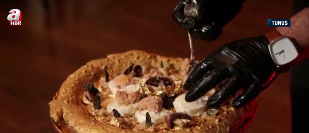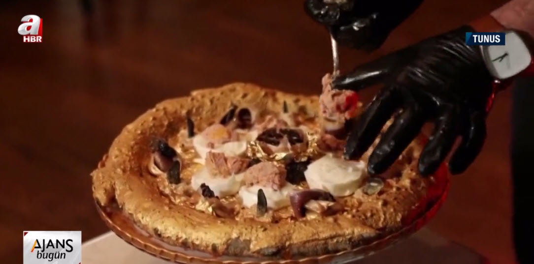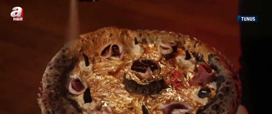 Son zamanların en lüks trendlerinden biri altınlarla süslenen yemekler. Son olarak Tunus'ta bir İtalyan restoranı menüsüne yenilebilir altın yapraklarla süslü bir pizza ekledi. Pahalı malzemelerle yapılan pizzanın fiyatı ise dudak uçuklatıyor.