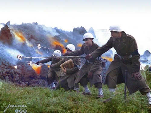Renklendirilmiş haliyle, büyük bir patlama gerçekleştiren Vesuvius Yanardağı'nın lavlarında ekmek kızartmaya çalışan ABD askerlerinin verdikleri poz, 18 Mart 1944.