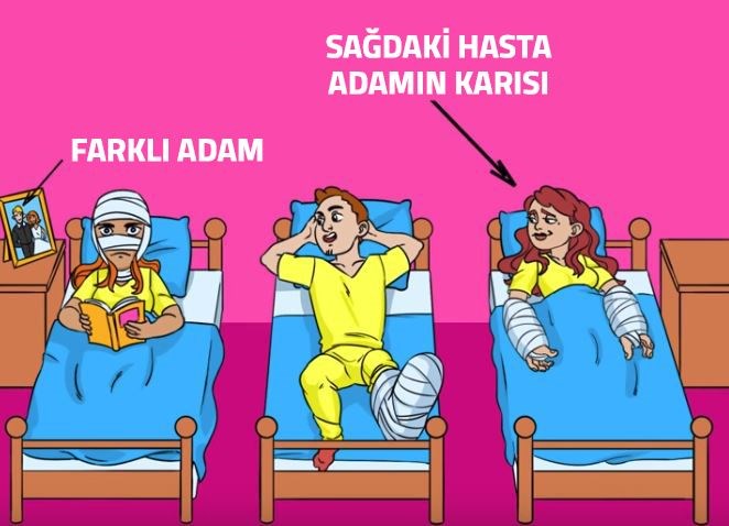Hastanede yatan 3 hasta içinde ortadaki adamın karısı A veya B'den hangisidir?