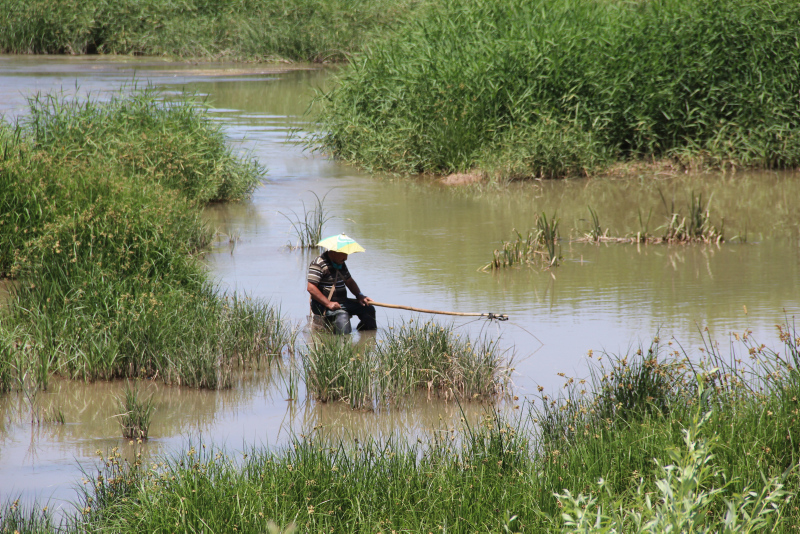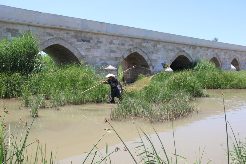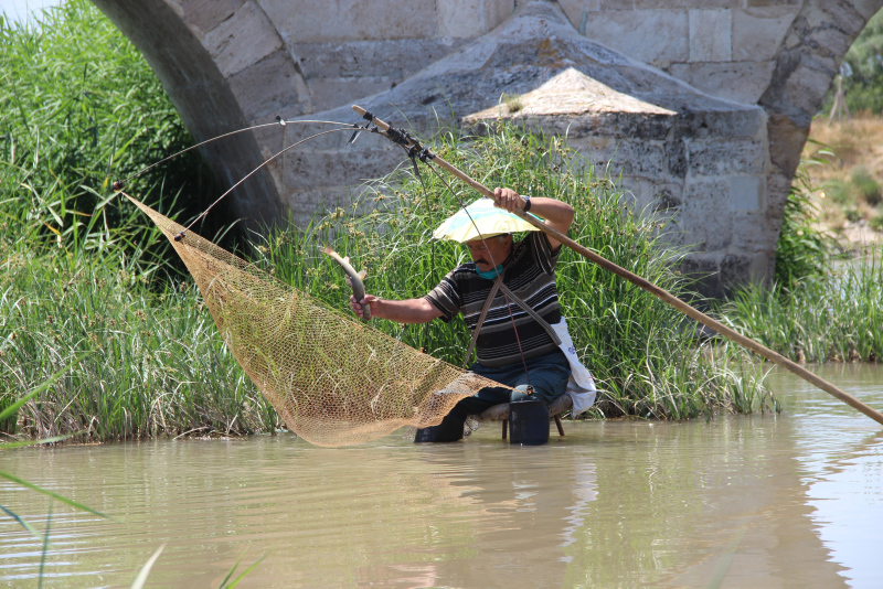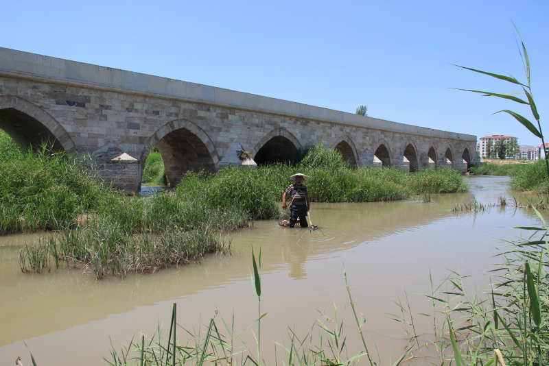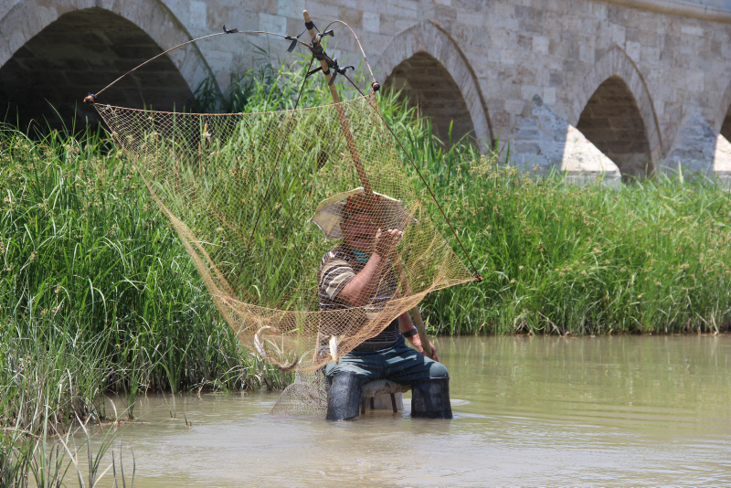 Yükçeker, kent merkezinden geçen Kızırırmağın Eğriköprü mevkisinde taburesiyle ırmağın ortasına oturup basma tor ismini verdiği olta sistemiyle hem balık tuttu hem de serinledi.
