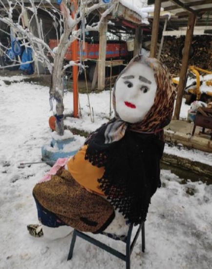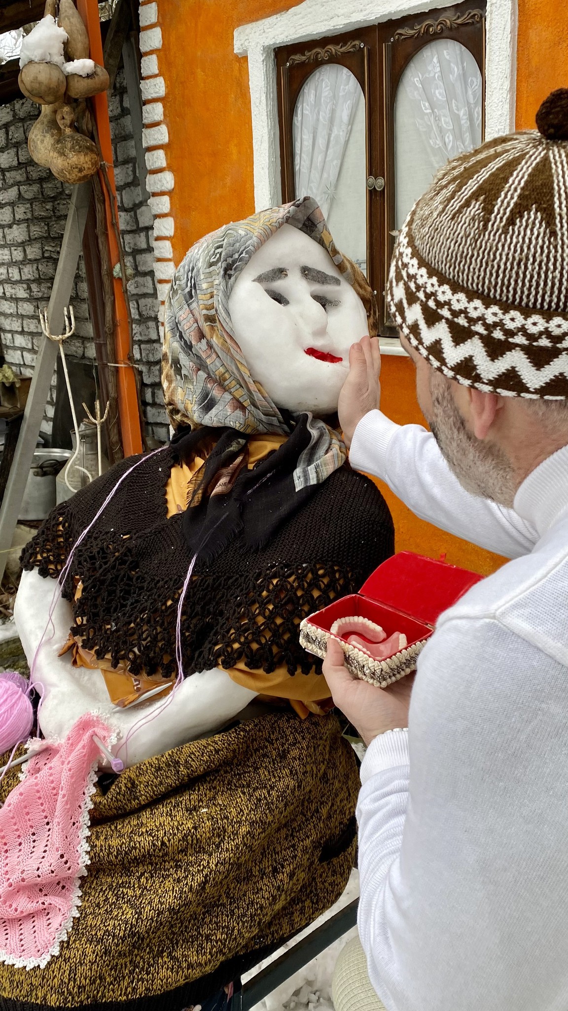 Yağan lapa lapa kara aldırış etmeden 3 saatlik çalışmayla kardan kadın yapan Kalktık, üşümesin diye ona babaannesinin kıyafetlerini giydirip yaşlılıkta en iyi hediye olarak düşündüğü takma diş hediye etti.