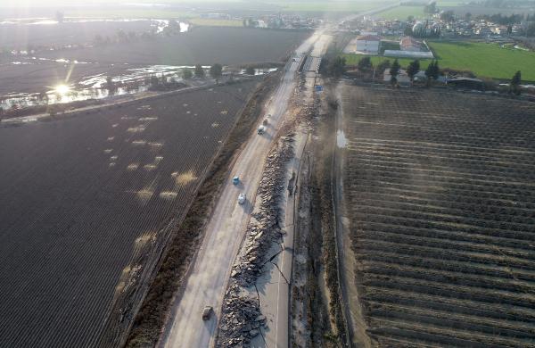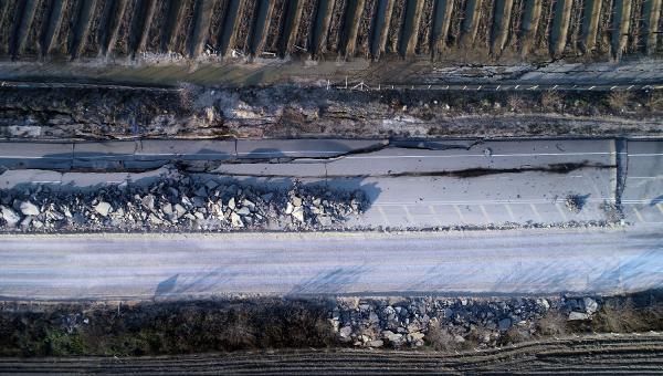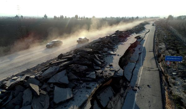 Türkiye asrın felaketiyle sarsıldı. Kahramanmaraş merkezli 10 ili etkileyen 7,7 ve 7,6'lık 2 büyük deprem, Antakya Demirözü Karayolu'nda büyük hasara yol açtı. Antakya'yı Reyhanlı ilçesine bağlayan bölünmüş yolda yaklaşık 1 kilometrelik çökmeler ve yükselmeler oldu. Depremin büyük hasar verdiği yol havadan böyle görüntülendi...