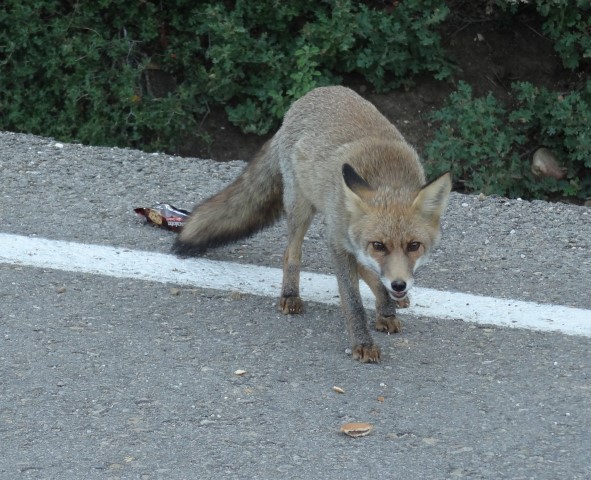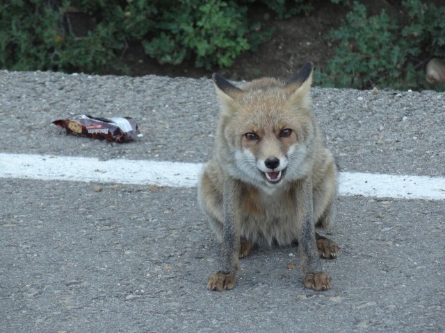 Tilki durdu, oturdu bana bakıyor. Herhalde bu tilkiyi önceden birkaç turist ekmek ya da bisküvi ile beslemiş, insanlara alışmış. Benden bir şeyler bekliyordu.