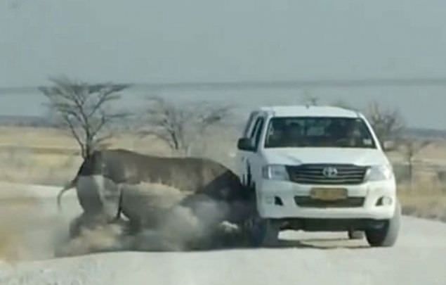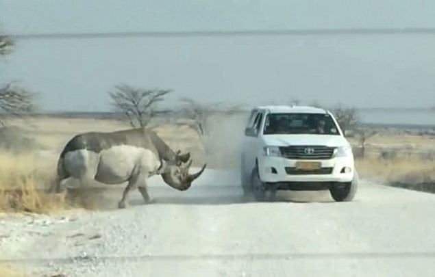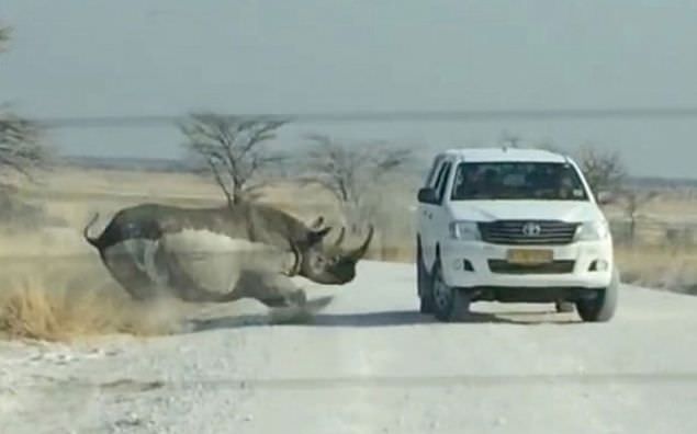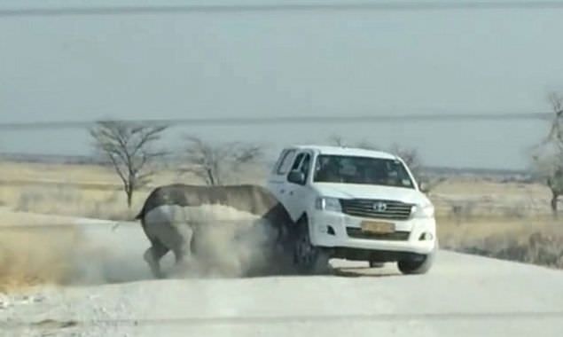 Nambiya'daki ulusal parktaki bir gergedan önce turistlerin bulunduğu aracı izledi. Gergedanın merakı hızlıca öfkeye döndü ve şiddetli bir şekilde cipe çarptı.