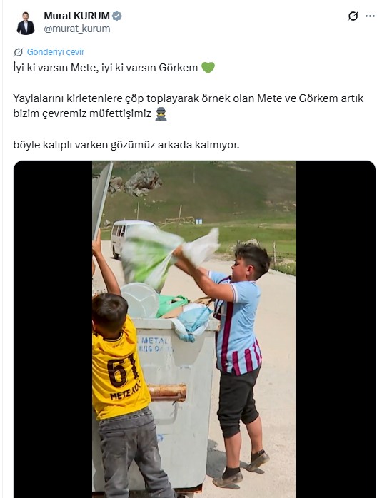 Çevre, Şehircilik ve İklim Değişikliği Bakanı Murat Kurum, Gümüşhane'nin Taşköprü Yaylası'nda ziyaretçilerin çöp bırakmasına gösterdikleri tepki ile gündem olan Mete ve Görkem Koç kardeşlere teşekkür mektubu gönderdi. İki kardeşi 'çevre müfettişi' ilan eden Bakan Kurum, sosyal medya hesabından "İyi ki varsın Mete, iyi ki varsın Görkem. Yaylalarını kirletenlere çöp toplayarak örnek olan Mete ve Görkem artık bizim çevre müfettişimiz. Böyle çocuklarımız varken gözümüz arkada kalmaz." mesajını paylaştı.