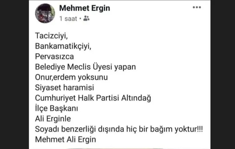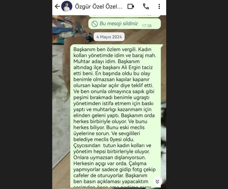 CHP Ankara Altındağ İlçe Başkanı Ali Ergin'i istifaya götüren süreç sonrası partide taciz skandalı patlak verdi. Taciz mağduru Altındağ Kadınlar Kolu Yöneticisi Özlem Sevgili yaşadığı süreci anlatırken, "Ali Ergin defalarca taciz girişiminde bulundu ve 'Benimle birlikte olmazsan sana bütün kapıları kapatırım' dedi." iddiasında bulundu.