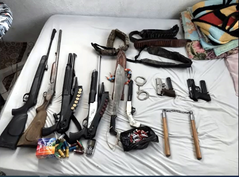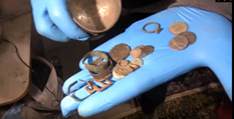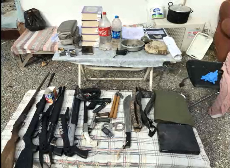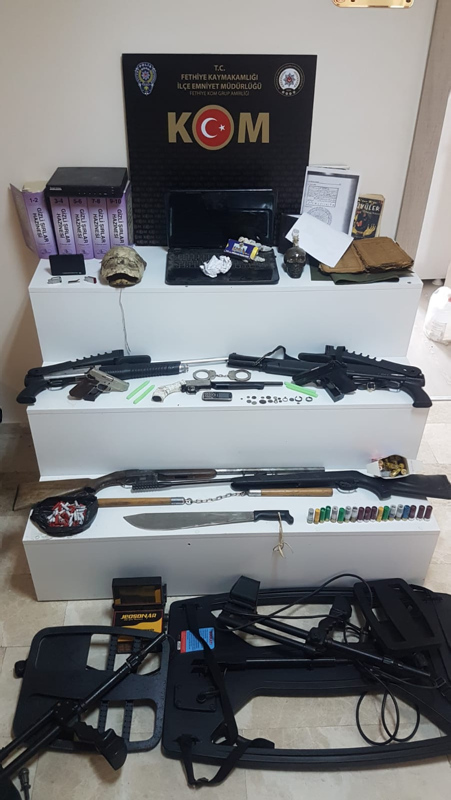 Koyuncu'nun evinde yapılan aramalarda ruhsatsız tabancalar, pompalı tüfekler, pala, mınçıka, kelepçe ile tarihi eser olduğu değerlendirilen sikke, yüzük, Kur'an-ı Kerim ele geçirildi.