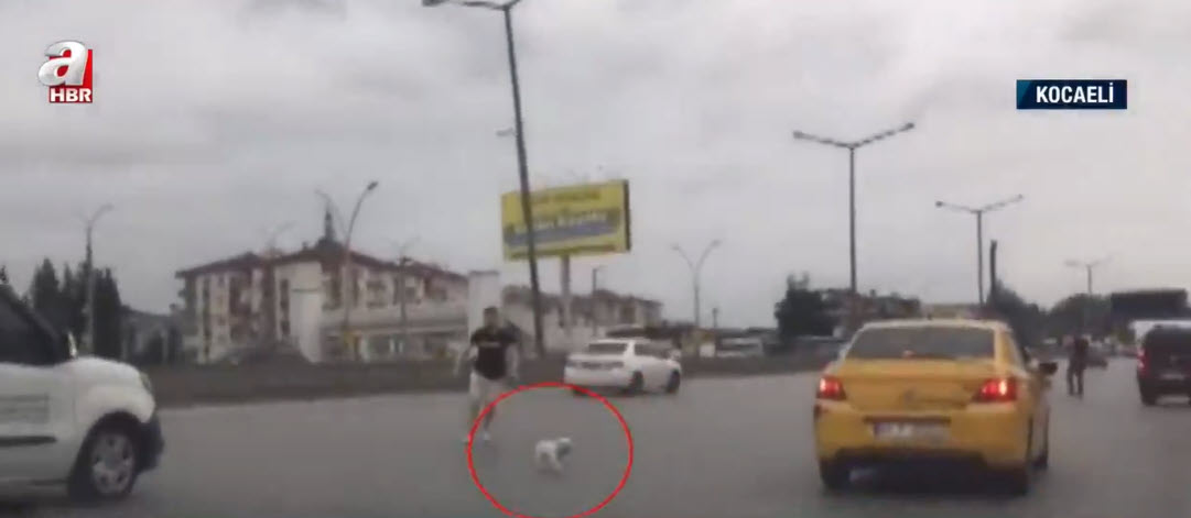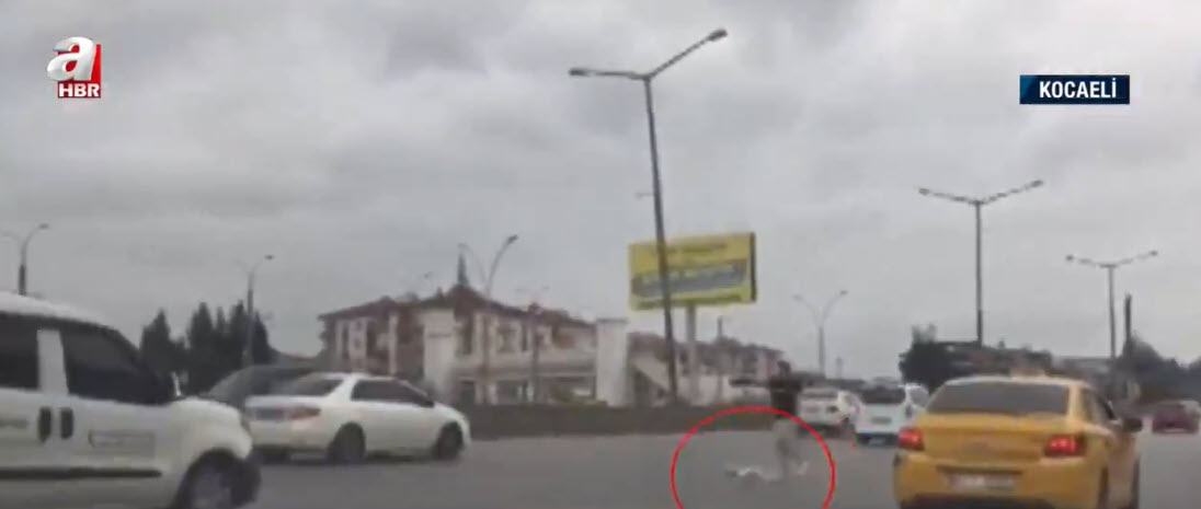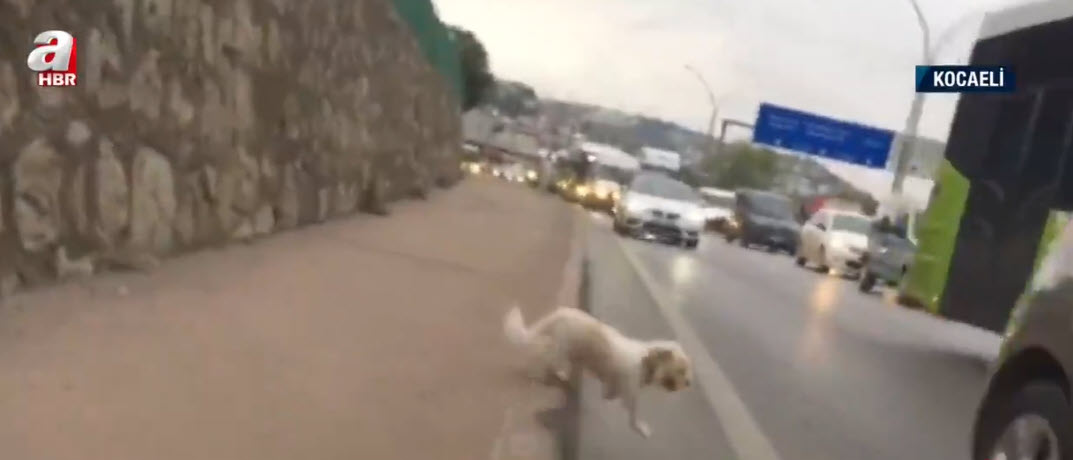 Kaçan köpeğin peşinden dakikalarca koştular. Görüntü Kocaeli D-100 karayolundan.