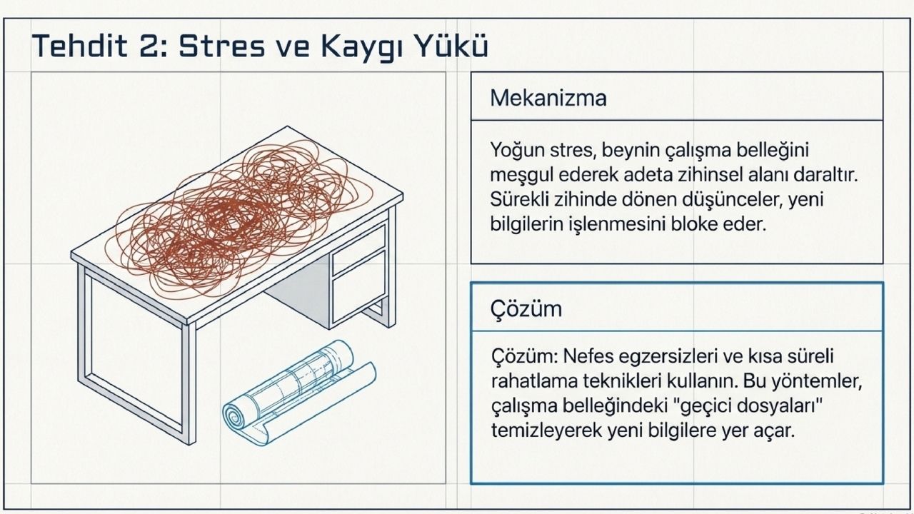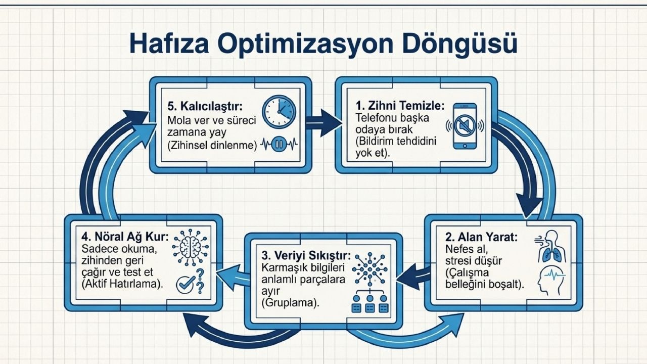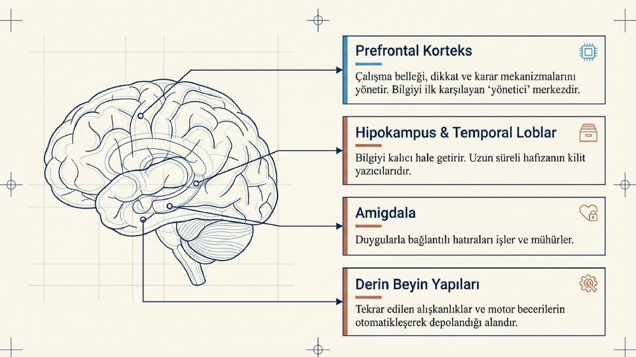 Hafıza, bilgiyi algılama, işleme ve depolama aşamalarından oluşan bir mekanizma olarak çalışır ve her aşama farklı beyin bölgeleri tarafından yönetilir. Çalışma belleğinin sınırlı kapasitesi, öğrenme ve hatırlama performansını doğrudan belirler. Dikkat, stres yönetimi ve öğrenme tekniklerinde yapılacak düzenlemelerle hem kısa süreli hem de uzun süreli hafıza daha verimli kullanılabilir.