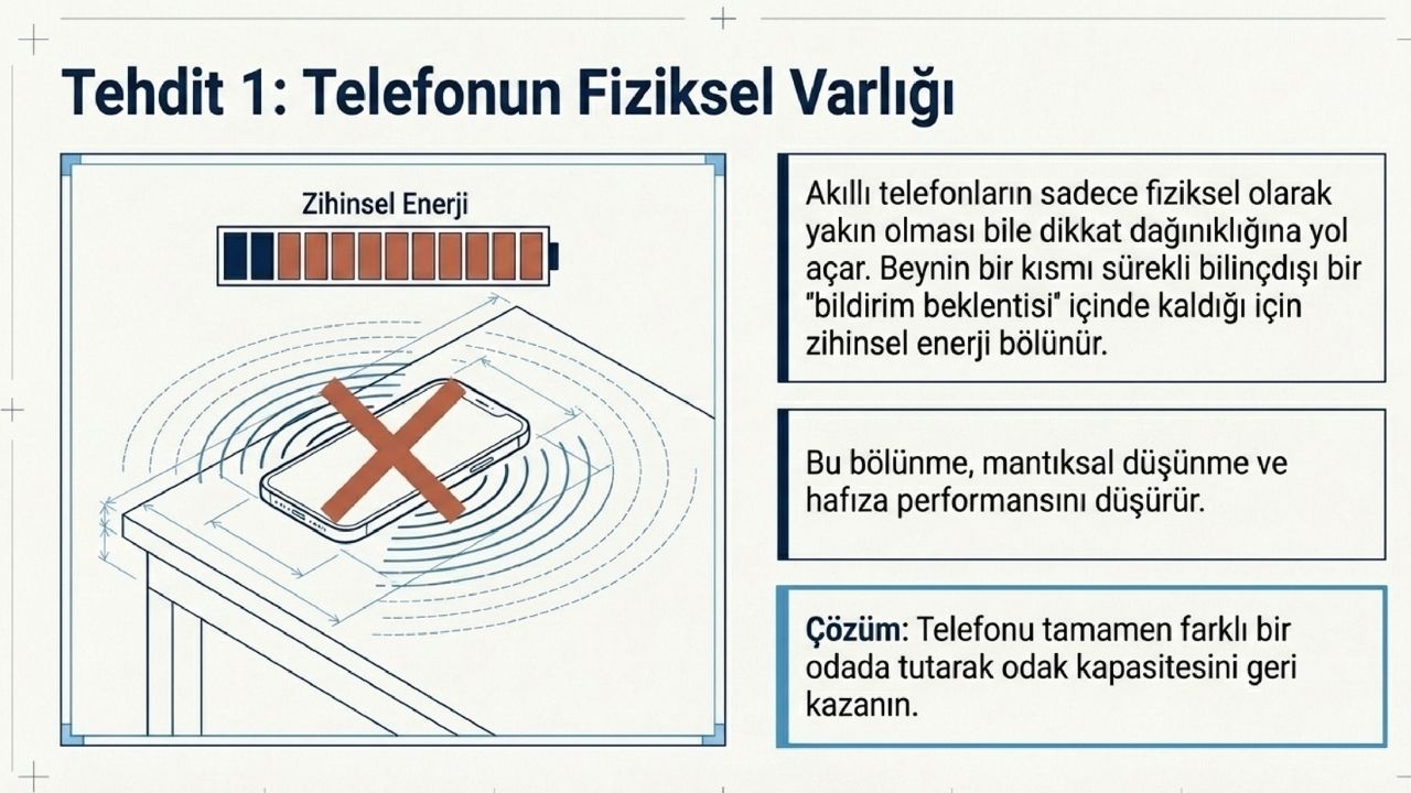 Akıllı telefonların sadece kullanımı değil, fiziksel olarak yakın olması bile dikkat dağınıklığına yol açıyor. Beynin bir kısmı sürekli bildirim beklentisi içinde kaldığı için zihinsel enerji bölünüyor. Bu durum hem mantıksal düşünme hem de hafıza performansını düşürüyor. Telefonun farklı bir ortamda tutulması, zihinsel kapasitenin daha verimli kullanılmasını sağlıyor.