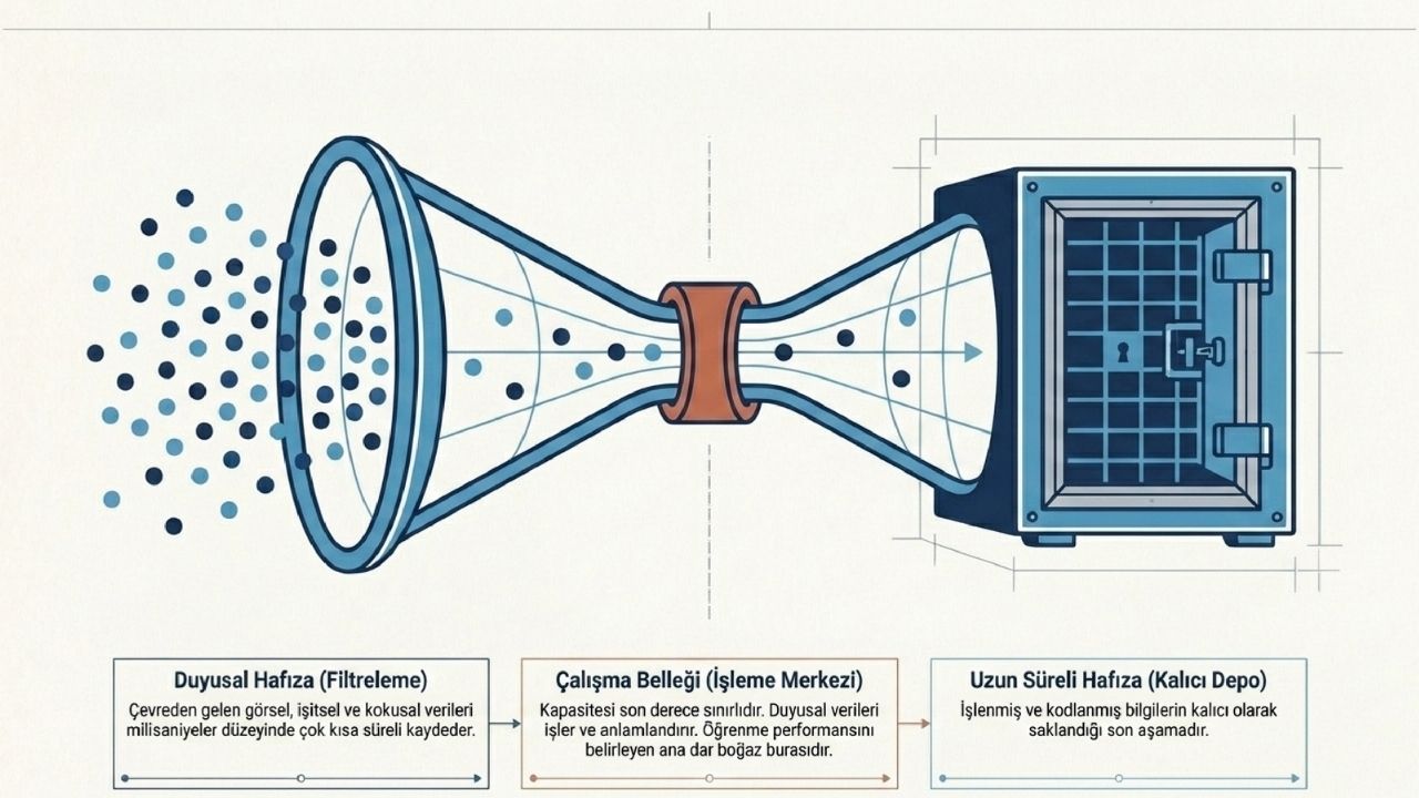 Hafıza, bilgiyi algılama ve saklama sürecinde üç temel aşamadan geçer. Duyusal hafıza, çevreden gelen görsel, işitsel ve kokusal verileri çok kısa süreli olarak kaydeder. Ardından çalışma belleği bu bilgileri işleyerek anlamlandırır. Son aşamada ise uzun süreli hafıza devreye girer ve bilgiyi kalıcı hale getirir. Bu üçlü yapı, öğrenmenin temel mekanizmasını oluşturur.