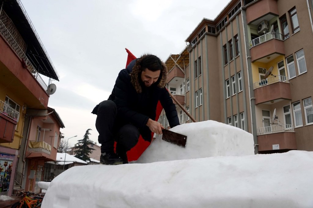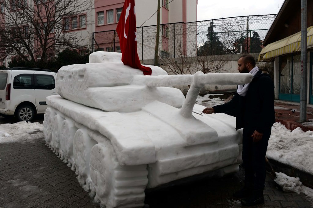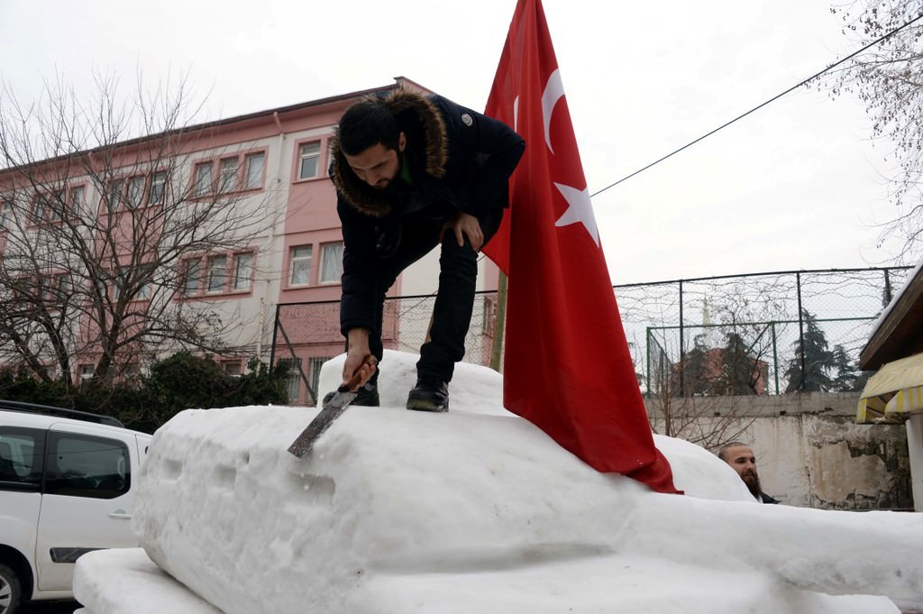 Bu sene de kardeşi ile iş yerinin önünde kardan tank yaptıklarını belirten Sarıca, "Karı bir araya getirmek için mahallemizin gençleri yardım ediyor. Gençler, 15 Temmuz darbe girişimine tepki amacıyla tank yapmamızı istedi. Biz de hain darbeyi kınamak için kardan tank yaptık." dedi.
