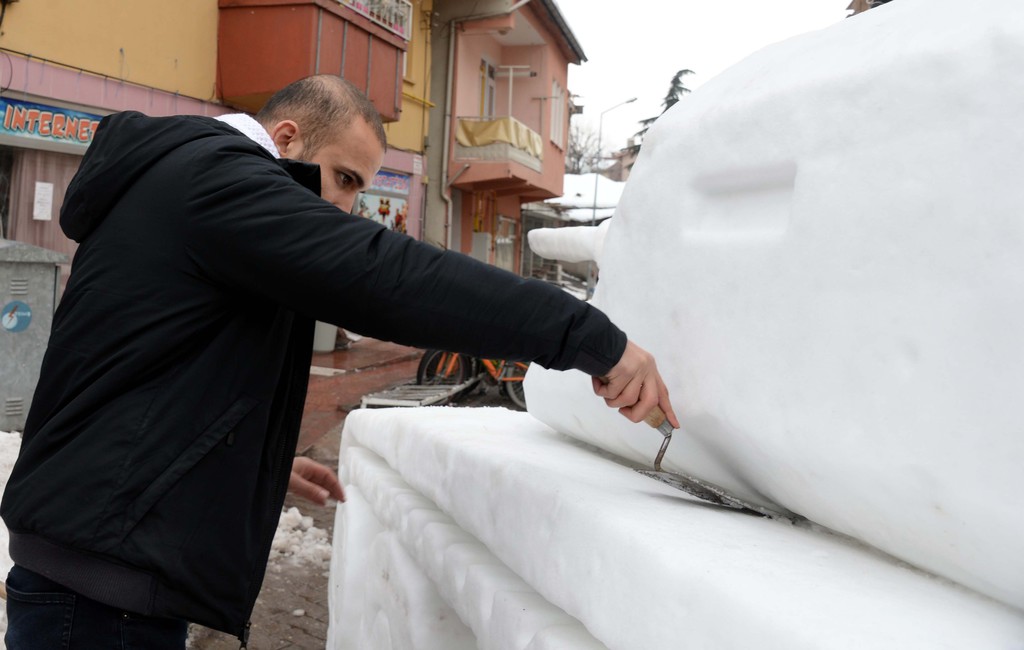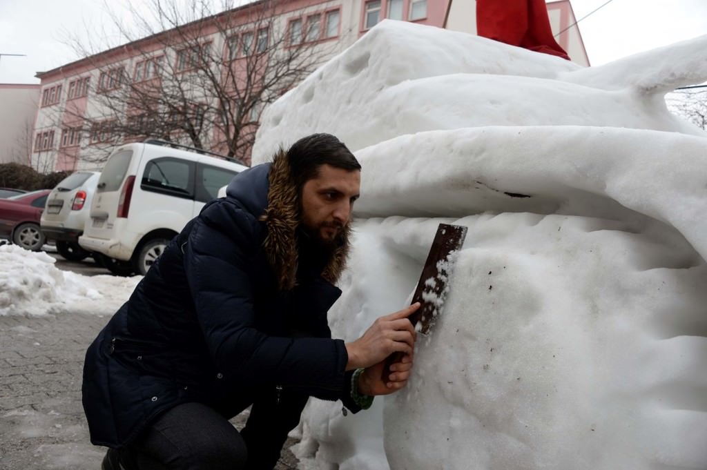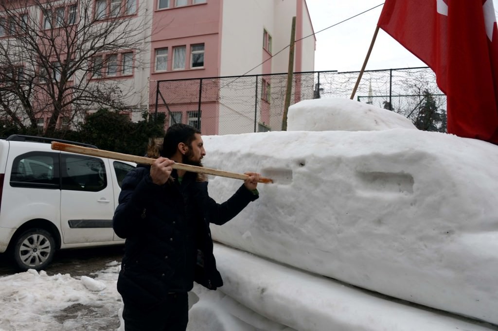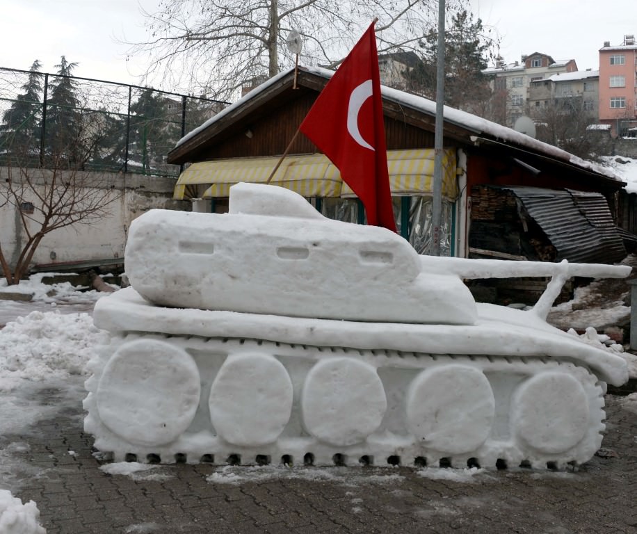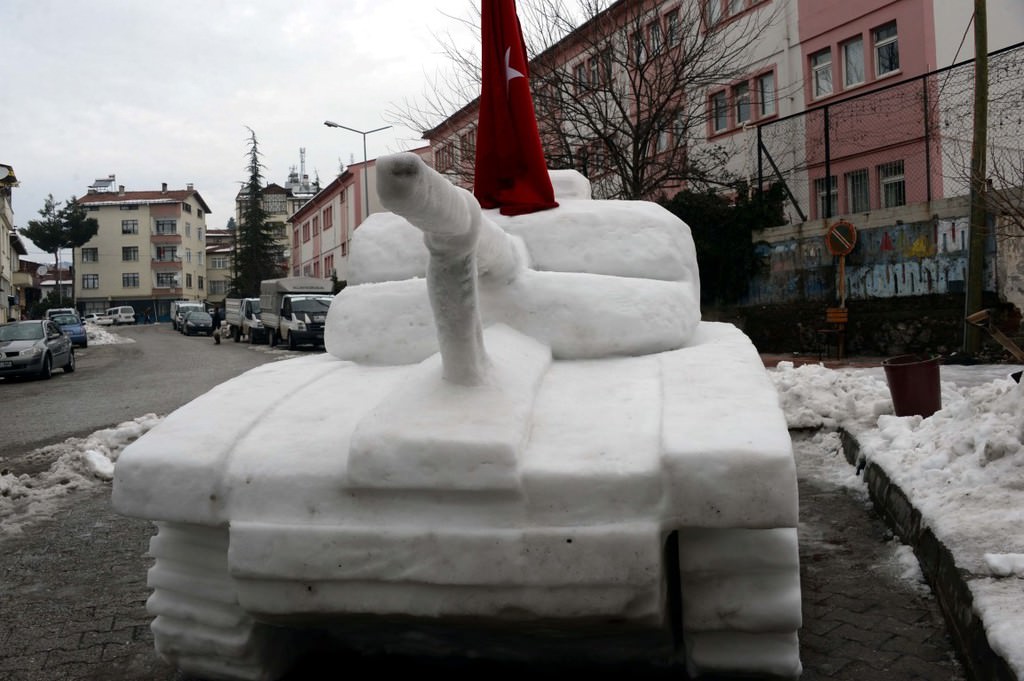 Gaziosmanpaşa Mahallesi'nde esnaf olan Yasir ve Şehit Sarıca kardeşler, çevredeki vatandaşların da yardımıyla topladıkları yaklaşık 4 ton kardan tank yaparak, üstüne Türk bayrağı astı.