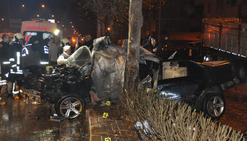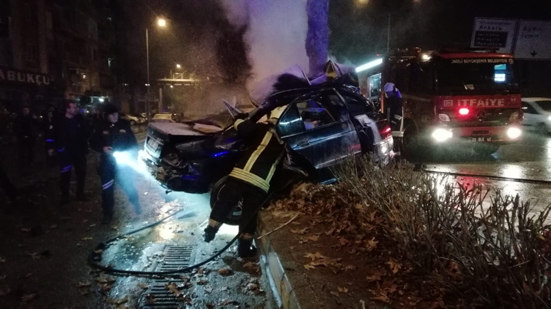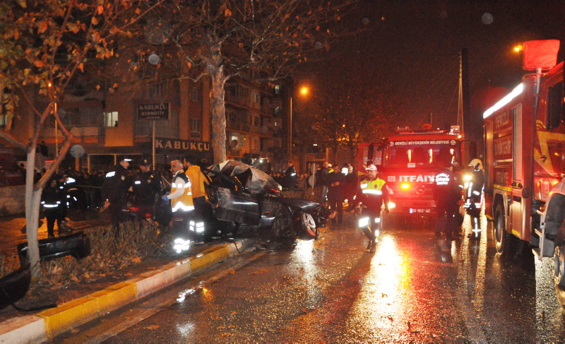 Denizli'nin Pamukkale ilçesinde aşırı hızlı olduğu iddia edilen lüks bir otomobil, sürücüsünün direksiyon hakimiyetini kaybetmesi sonucu ağaca çarptı. Çapmanın etkisiyle ikiye bölünen lüks otomobilde bulunan 1 kişi hayatını kaybederken, 3 kişi de yaralandı. Kazanın ardından birçok kişi yağmurlu havaya rağmen kurtarma çalışmalarını izledi.