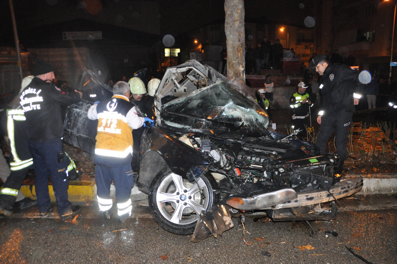 Kontrolden çıkan lüks otomobil yolun kenarındaki ağaca çarptı. Çarpmanın etkisiyle otomobil ikiye bölünerek alev aldı.