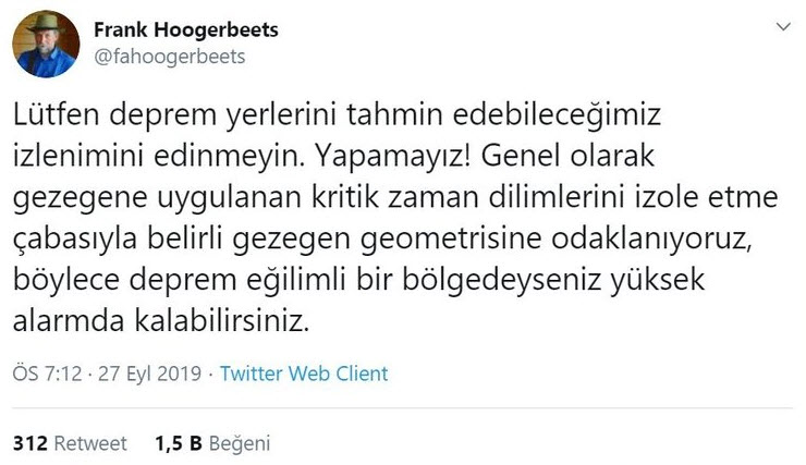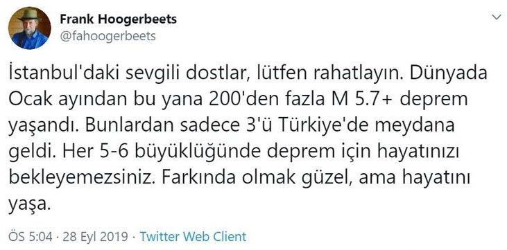 Öte yandan bir diğer Hollandalı deprem uzmanı olan Hoogerbeets geçtiğimiz günlerde Türkçe tweet atarak konuyla ilgili rahatlatan açıklamalarda bulunmuştu. İşte Hoogerbeets'in o sözleri;