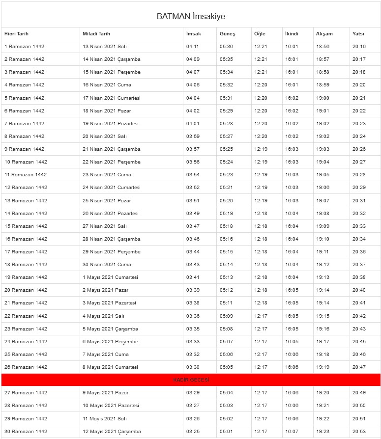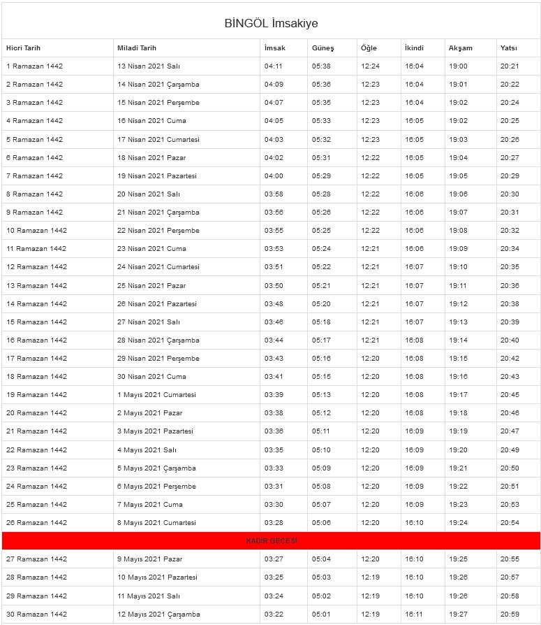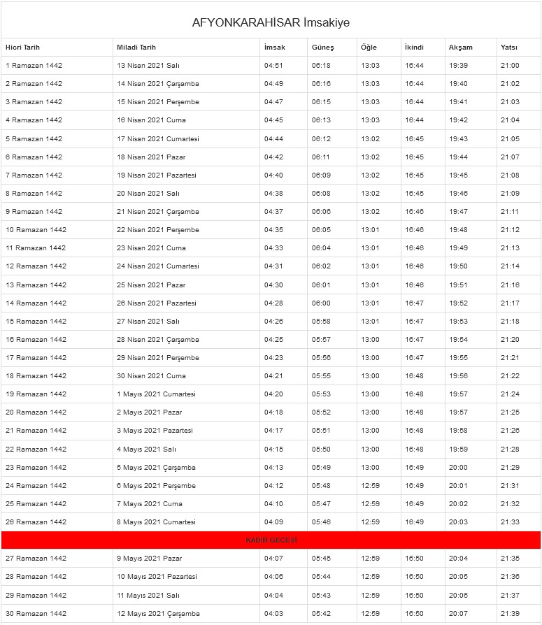 Ramazan imsakiyesi, son günlerde en çok aranılanlar arasında yer alıyor. Ramazan ayının yaklaşması ile birlikte iftar ve sahur vakitlerini merak eden vatandaşlar, 2021 Ramazan imsakiyesi ile ilgili araştırmalarını sürdürüyor. Diyanet tarafından 81 ile ait Ramazan imsakiyesi paylaşıldı. İstanbul, Ankara ve İzmir başta olmak üzere il il Ramazan imsakiyesine ahaber.com.tr'den ulaşabilirsiniz. Peki, sahur ve iftar vakti kaçta? İşte il il 2021 Ramazan imsakiyesi...