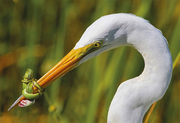 ABD'nin Florida eyaletinde, beyaz balıkçıl ve bir yılan arasındaki kavgayı gösterdiği bu fotoğraf