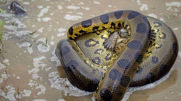 Bir göletin içinde anakonda kaplumbağayı kıskıvrak yakaladı.