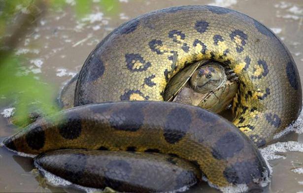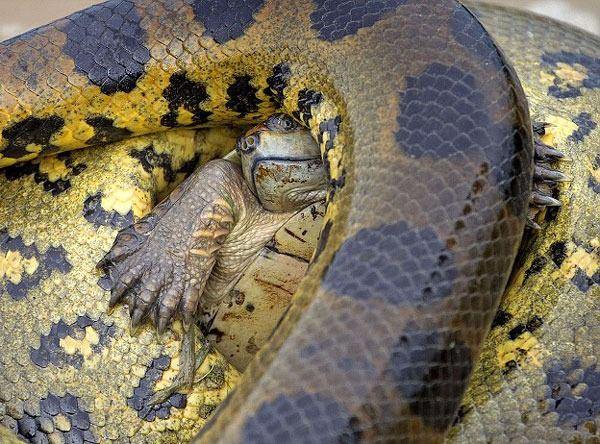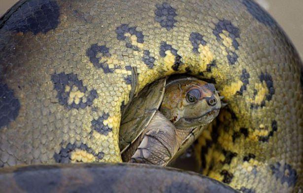 Minik kaplumbağa dev anakondaya sonuna direndi ve sert kabuğu sayesinde ölümden kurtuldu. Bir anda suyun içinde hamle yapan kaplumbağa yem olmaktan kıl payı kurtuldu.